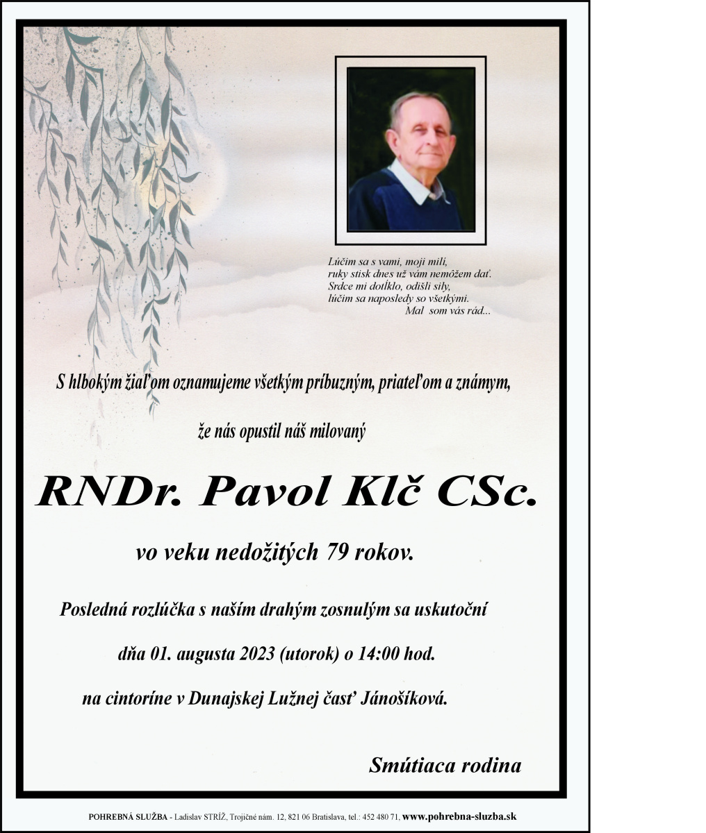 1. August 2023 - RNDr. Pavol Klč CSc. (79)